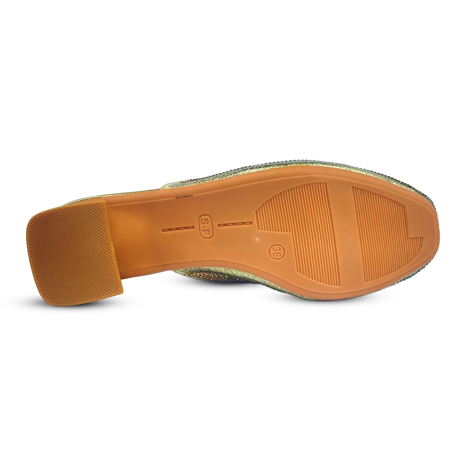 Step into sophistication with our Mules with Heel. These golden mules feature an elegant glittering design and sparkling rhinestones, adding a touch of glamour to any outfit. Whether you're attending a formal event or a night out, these mules with block heel offer a comfortable yet stylish choice.